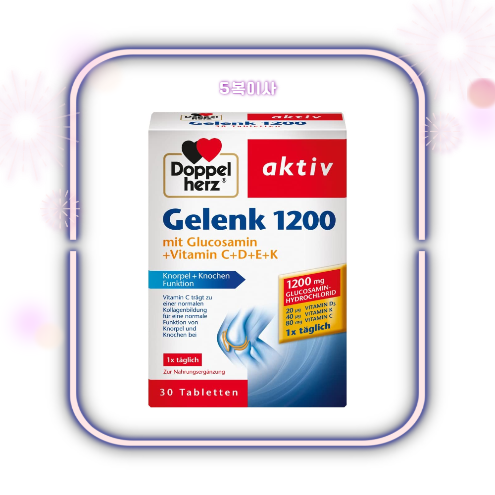 Doppelherz Gelenk 1200은 비타민 C, 비타민 E, 비타민 K 및 비타민 D를 함유하고 있습니다. 또한 단 1정에 1200mg의 글루코사민 염산염을 함유하고 있습니다.